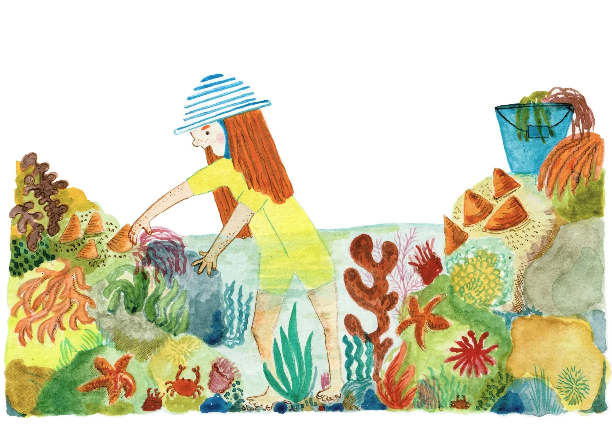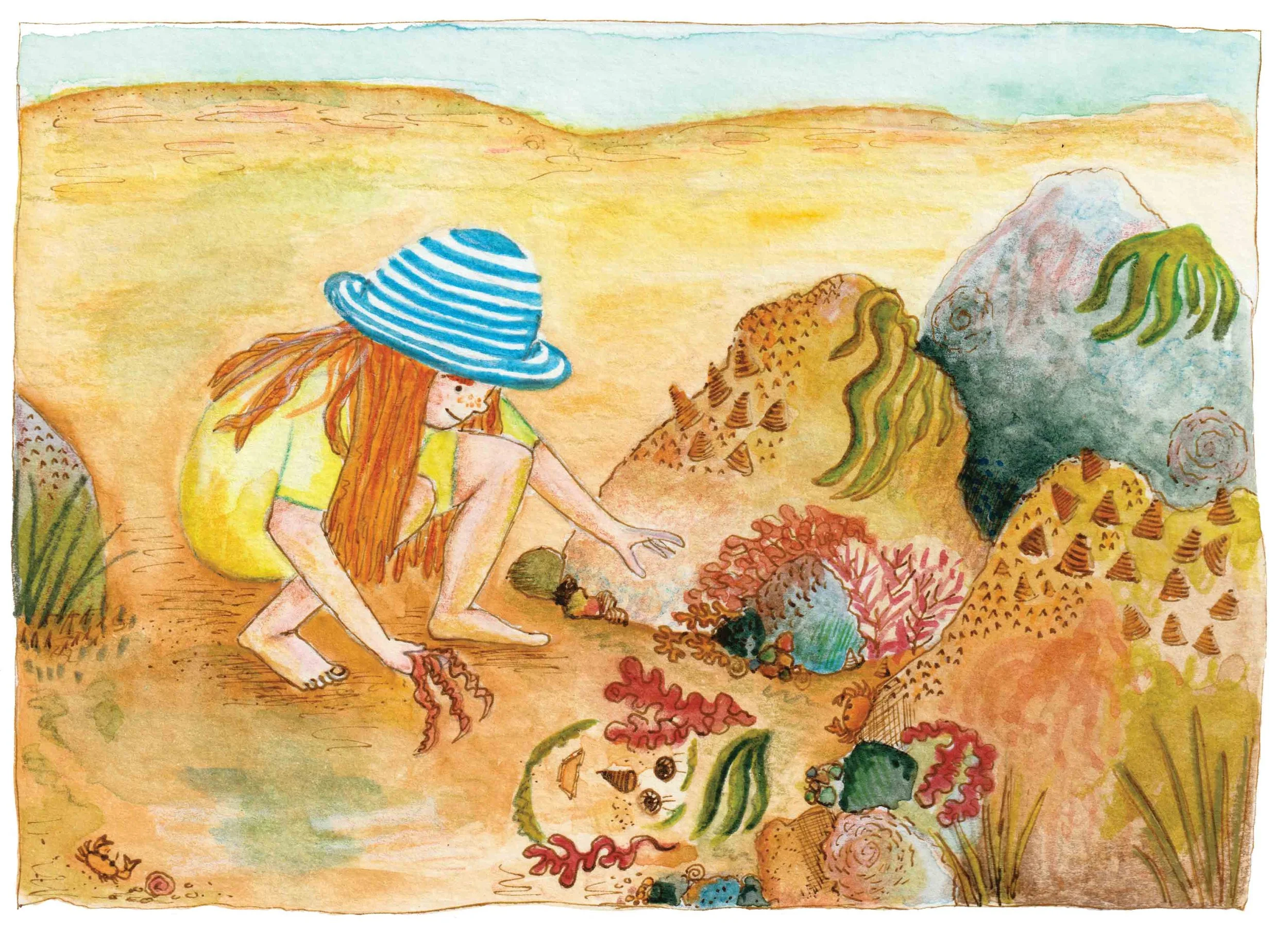 A story book idea about a young girl who finds it hard to make friends, she prefers to play among the cool rock pools, watching the crabs and shrimps and snails. Feeling the textures of the slimey anemones and rough limpets. Arranging the sea weed to makes faces.