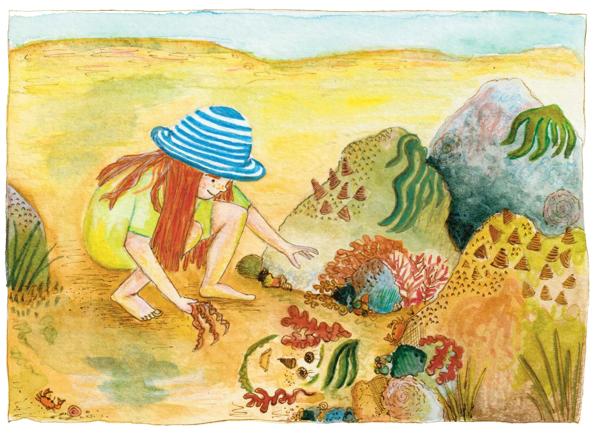 She watches the other children, finds it hard to understand their games. She starts to protect the crabs and creatures from the kicking, flying sand. Returns the beached jellyfish to the sea. Gathers seaweed to make shelter for the rock pool animals. Slowly the noisy children start to help her.
